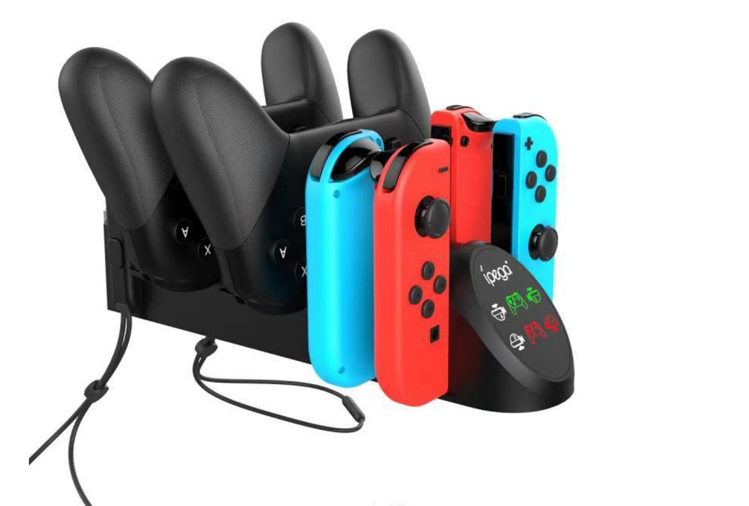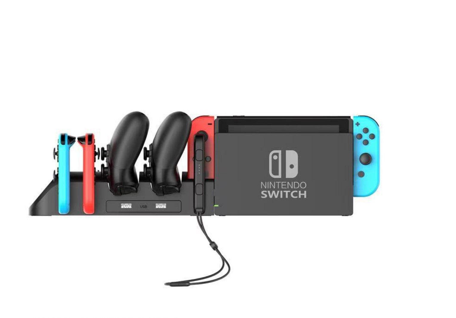 This station attachs to your Nintendo Switch dock and charges 4 joy con's and two pro controllers at the same time! And is just powered by your original dock, it also has extra male USB 2.0 ports for anything else you need. So in total you could charge 6 joycon's, 2 pro controllers and has a wrist strap socket for easy storage!